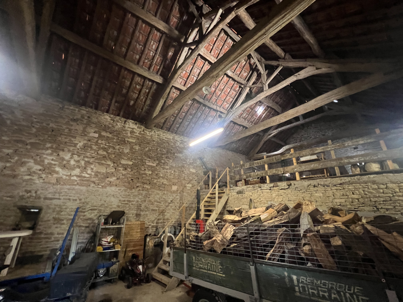 À l'étage se trouvent trois chambres ainsi qu'une salle d'eau avec baignoire. L'ensemble est desservi par une climatisation réversible (pompe à chaleur air/air). Chauffage central au bois.