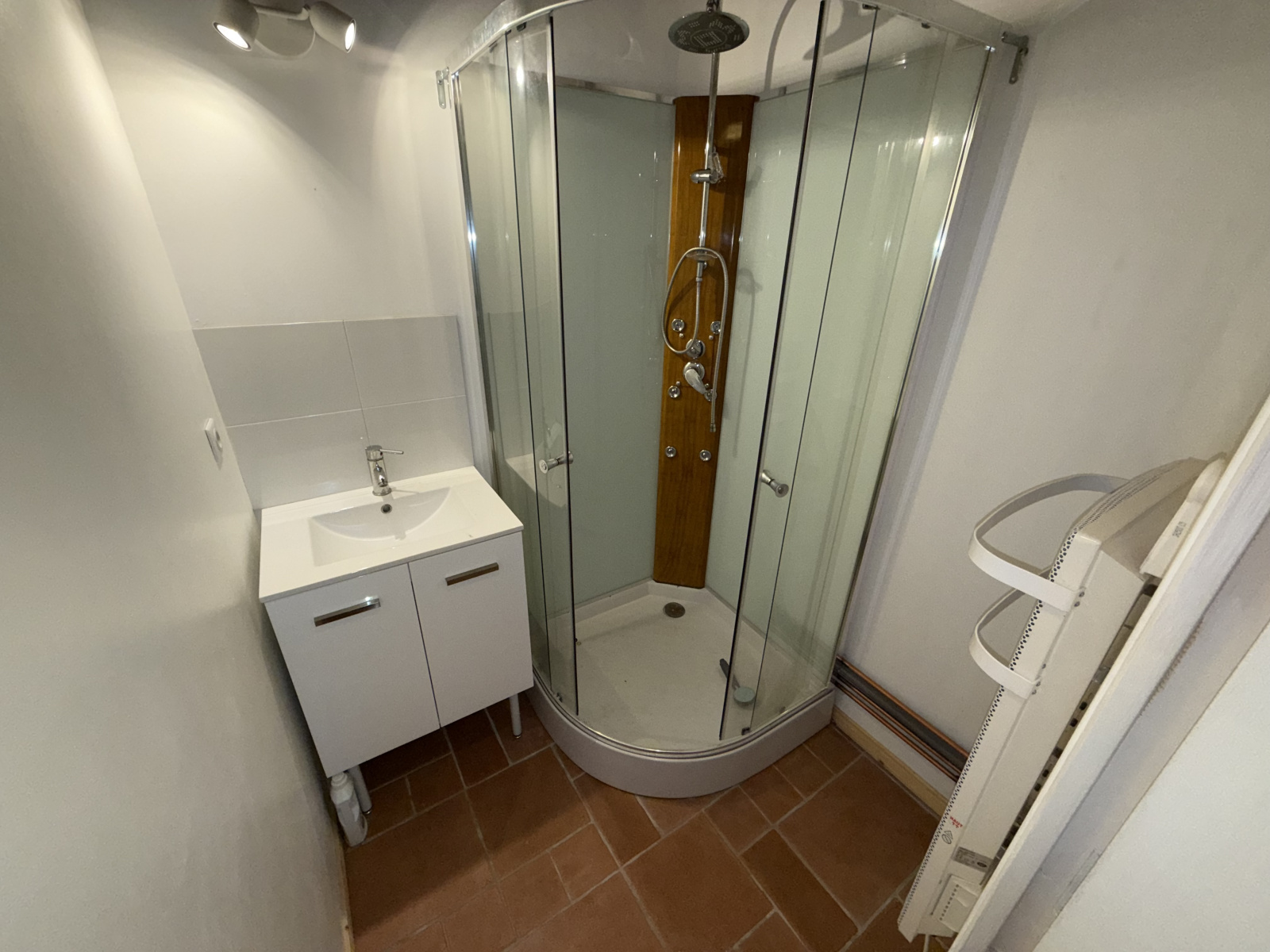 À l’étage principal : un grand salon avec pierres et poutres apparentes, une cuisine, une salle de bains avec WC.