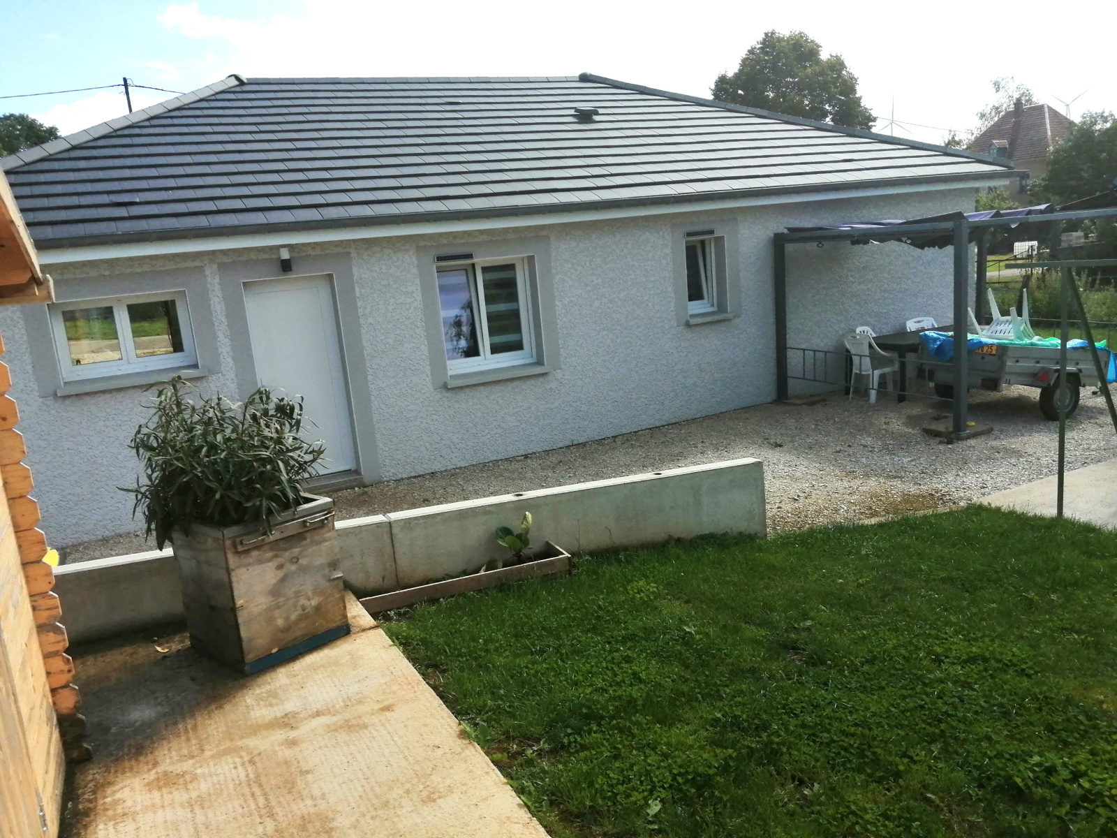 Une dépendance ossature bois faisant office de rangement jouxtée d'un coin jardin.