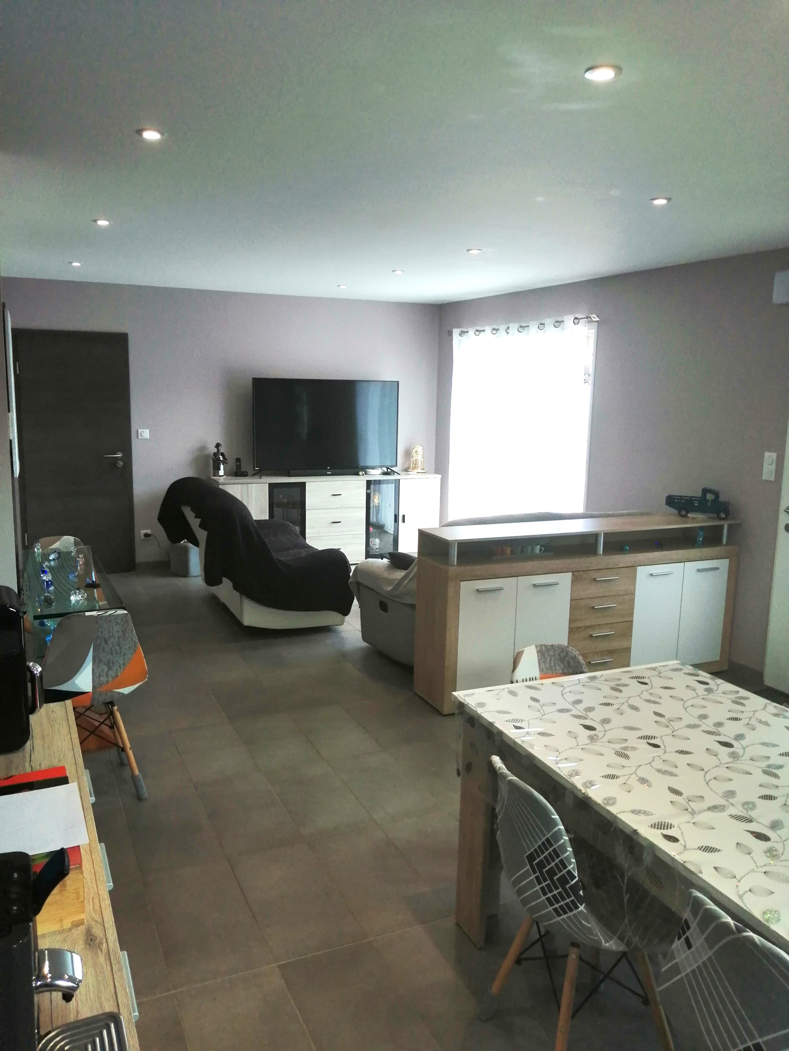 Entrée sur une grande pièce à vivre avec cuisine aménagée / équipée et salon, deux chambres, salle d'eau avec douche italienne / vasque sur meuble / sèche linge mural, wc séparé suspendu, l'ensemble est carrelé avec accès direct au garage isolé sur chape béton avec une porte donnant sur terrasse à l'arrière de la maison.