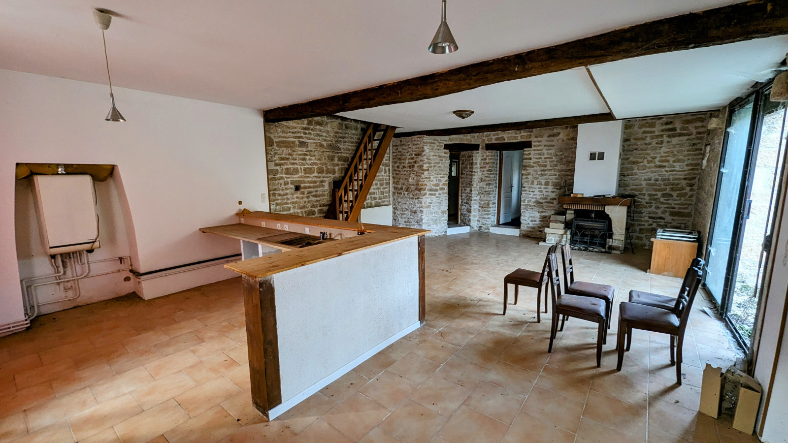 -Une autre bâtisse d’environ 150m² habitables à usage d’habitation, composée d’une grande salle de 50m² avec espace cuisine, une chambre, salle de bains avec wc et coin buanderie. A l’étage, trois chambres en enfilade et une salle d’eau à finir d’installer. Chauffage central gaz. Piscine